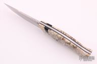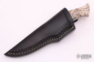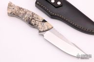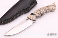 This knife by Michael Bodnar features a satin finished blade with false top edge and notched thumbrest, .155" blade stock and 1.469" blade depth, full tang construction. The handle has stabilized cross cut mammoth ivory scales with black G-10 liners and mosaic pins. Comes with a black leather sheath. Excellent condition.