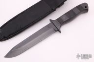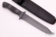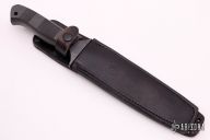 This Recce Combat by Peter Bauchop features a black clip point blade with sharpened top edge, .235" blade stock and 1.342" blade depth, full tang construction. The handle has a black stainless steel guard, black coated canvas micarta scales with lanyard hole. Comes with black leather sheath. Has some light sheath marks, otherwise excellent condition.