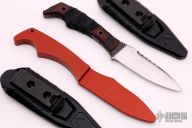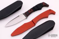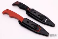 This knife features a spear point blade with false top edge and notched thumbrest. The handle has sculpted G10 scales over full tang construction. .098" Blade Stock. .930" Blade Depth. Jimping on pommel provides purchase when holding in the reverse grip. Grip tape has been wrapped around the handle and the blade has been reground. Includes a molded plastic sheath with metal clip. Includes red anodized aluminum trainer. Scratches are visible on the blade otherwise the knife is in okay condition.