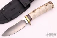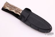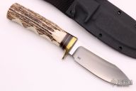 This knife by Bob Dozier features a hand ground satin finished drop point blade with .195" blade stock and 1.163" blade depth, hidden tang construction. The handle has a brass guard, stag finger grip handle, and red/brass/black linen micarta spacer pattern. Comes with a kydex sheath with belt loop. Excellent condition.