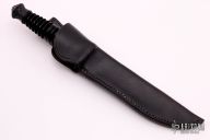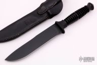 This knife by Jim Pugh features a black blade with false top edge, .242" blade stock and 1.491" blade depth, hidden tang construction. Texture black steel guard and butt with ribbed wood grip. Comes with a black leather sheath that is marked "0038". Has a few light scuffs, otherwise excellent condition.
