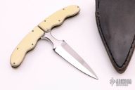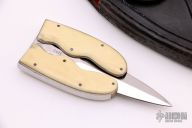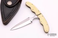 This Folding Push Dagger by Jim Ence is COOL. It features a mirror polished blade with .227" blade stock and .848" blade depth. The handles are mammoth ivory with nickel silver liners and steel backspacers with brass blade stops. Comes with a black leather sheath with red velvet lining. Excellent condition. Very Cool.