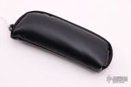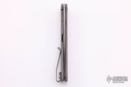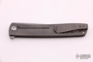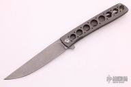 This Urban Trapper by Brad Zinker features a tumble finished blade with notched flipper, .103" stock. The handle has a tumble finished titanium frame with a matching tip up clip, .090" thick titanium slabs. Nice detent, lockup and blade seating. Comes with a leather zippered case. Excellent condition.