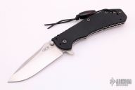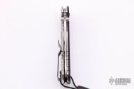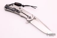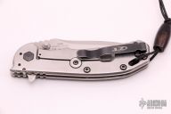 This 0566 Hinder Design Flipper by Zero Tolerance features a tumble finished drop point blade with swedge, dual thumb studs, notched thumb rest and flipper. The handle is comprised of a black G10 scale over a titanium liner and a tumbled titanium lockside over black barrel spacers. The black coated steel tip up clip is reversible for right or left hand carry. Lanyard hole in pommel. Has some scratches, has been used and sharpened, otherwise good condition. Comes with Zero Tolerance box and papers.