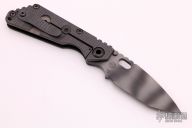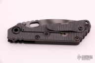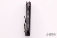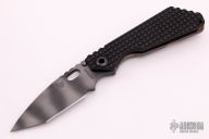 This SNG by Strider Knives features a tiger striped tanto blade with notched thumbrest and thumbhole. The handle has a Frag pattern black aluminum and flamed titanium frame with matching tip up clip. Nice detent, lockup and blade seating. New condition.