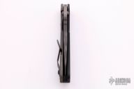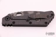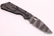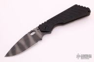 This Mick Strider SMF Fatty framelock folder features a tiger striped blade with thumbhole and notched thumbrest. The handle has a black aluminum and flamed titanium frame with titanium clip, tip up carry. Jimping on blade spine. Nice lockup, detent, and blade seating. New condition.