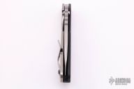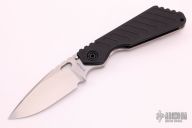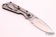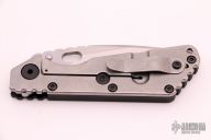 This Mick Strider SMF Fatty framelock folder features a stonewashed blade with thumbhole and notched thumbrest. The handle has a black aluminum and stonewashed titanium frame with titanium clip, tip up carry. Jimping on blade spine. Nice lockup, detent, and blade seating. New condition. NSN: 1095-01-531-5015