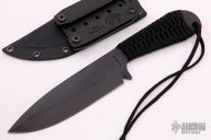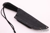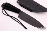 This Fighter from Mick Strider features a black coated blade with a nice deep swedge and false top edge. The blade stock is .214" with a blade depth of 1.799". This beast has a cord wrapped handle and a black kydex sheath. New condition.