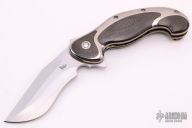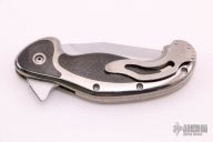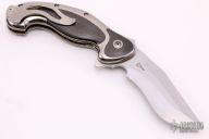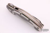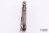 This Front Line linerlock flipper by Todd Begg features a hand-rubbed satin finish blade and a titanium frame with Lightning Strike carbon fiber inlays. Checker file work on thumbrest and flipper. Liners, backspacer, and clip have a jeweled ice texture. Riser posts on clip. Includes IKBS (Ikoma-Korth Bearing System) for smooth and fast flipper opening that requires no wrist action. Perfect blade seating, lockup, and detent. Outstanding work. Excellent condition. Comes with a 1060 Pelican case.