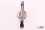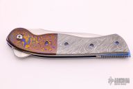 This Custom Flipper by Jim Smyth features a hand rubbed satin finished 154CM blade with notched thumbrest and flipper. The handle has timascus dovetailed bolsters, Damascus scales, notched and anodized titanium backspacer, anodized titanium screws, satin finished titanium liners with blue anodized interiors. Nice detent, lockup and blade seating. Excellent condition. Comes with zippered case.