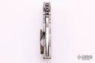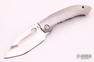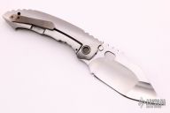 This Unnamed from Dalibor Bergam features a satin finished blade with notched thumbrest and thumbhole. The integral handle is comprised of a orange peel finished titanium with a head colored Damascus pocket clip positioned for tip up carry. The blade is centered when closed, opens/closes smoothly, and locks up with absolutely no play. Excellent condition. Comes with a custom brown leather sheath.