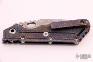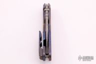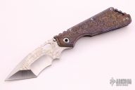 This MSC XL by Mick Strider features a two-tone tanto recurve blade with notched thumbrest and a thumbhole. The handle has a textured and anodized titanium frame with matching tip up clip. Clip can be left or right reversible. Comes with zippered case. Nice detent, lockup and blade seating. Excellent condition.