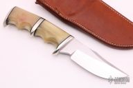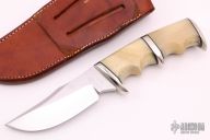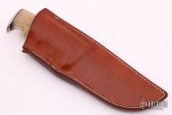 This hunter by RJ Knives features a satin finish blade, nickel silver guard and butt, and sheep horn grip, black spacers. .251" blade thickness and 1.430" blade depth. Hidden tang construction. Comes with brown leather sheath and original box. Great feel in the hand. Has some scratches and patina, otherwise good condition.