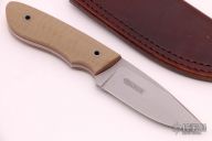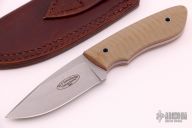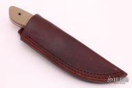 This drop point hunter by WF Steenkamp features a stonewash finished blade with .149" thickness and 1.244" depth, full tang construction. The handle has brown G-10 scales with red liners and tube pins. Comes with leather sheath and zippered case. Excellent condition.