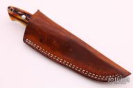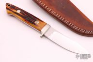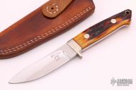 This Loveless Style Semi-Skinner by WC Davis features a mirror polished drop point blade, nickel silver fittings, and jigged bone scales with red liners, .183" blade thickness and 1.005" blade depth, full tapered tang. Comes with a brown leather sheath. Excellent condition. Sporting Classics 1 of 75