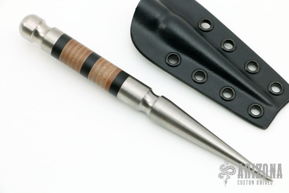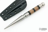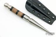 This Titanium Marlin Spike by Patrick Ober is made from satin finished titanium with black G-10 and stacked leather grip. Comes with a kydex sheath and original bag. New from maker.