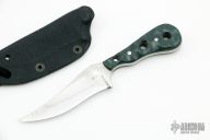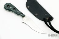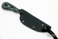 This neck knife by T Lopes features a recurve blade with visible temper line, .111" blade stock and .884" blade depth, full tang construction. The handle has green G-10 scales. Comes with a kydex sheath. Has some light scratches, otherwise good condition.