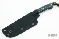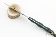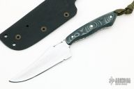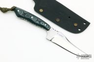 This neck knife by T Lopes features a chisel ground blade with visible temper line and fileworked tang, .123" blade stock and 1.052" blade depth, full tang construction. The handle has black/green/grey G-10 scales. Comes with a kydex sheath. Has some light scratches, otherwise excellent condition.