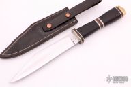 This Seax by Peter Bromley features a satin finished clip point blade with 0.199" blade depth and 1.395" blade depth, hidden tang construction. The handle has a nickel silver and brown canvas micarta guard, fileworked brass butt, and an ebony grip with nickel silver and brown canvas micarta spacers. Includes a brown leather sheath with belt loop. New from maker.