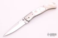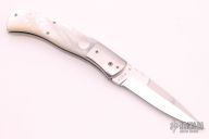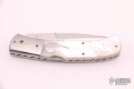This D/A lockback auto by Charlie Dake features a mirror finished blade with false top edge and mother of pearl inlaid thumbstud, fileworked blade spine. The handle has stainless steel dovetailed bolsters, mother of pearl scales, and stainless steel liners and backspacer with filework. Nice lockup, action and blade seating. #9504 on blade. Has some light scratches, otherwise good condition.