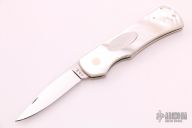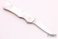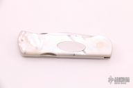 This side opening automatic features a mirror polished blade with a single nail nick.  The handle features mother-of-pearl scales over nickel silver liners.  The blade is released by pushing down on the escutcheon.  Light scratches are visible on the blade otherwise the knife is in excellent condition.