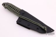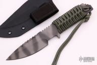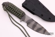 This HT by Strider Knives features a double edged spear point blade with tiger stripe finish and serrated top edge, .192" blade stock and 1.299" blade depth, full tang construction with paracord wrapped handle with lanyard. Kydex sheath. Excellent condition.