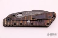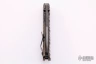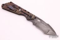 This Mick Strider custom SMF XL framelock folder features a Damascus blade with swedge, fileworked spine and thumbhole. The handle has a carved Damascus and anodized titanium frame with matching tip up clip. Nice detent, blade seating and lockup. Comes with zippered case. Excellent condition.