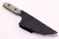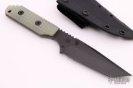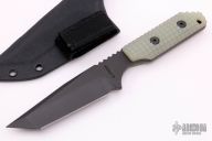 This Mick Strider DBL has a black tanto blade with notched thumbrest, .199" blade stock and a blade height of 1.238". The handle is comprised of jade G-10 scales with MEFP, lanyard hole in pommel. Includes kydex sheath. New condition. From 2021 Monkey Muster.