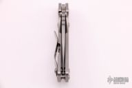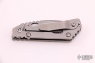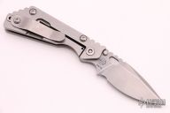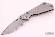 This PT by Mick Strider features a stonewashed blade with notched thumbrest and thumbhole. The handle has a stonewashed titanium frame with matching tip up clip. New condition.