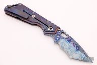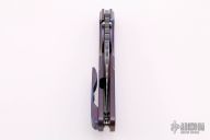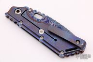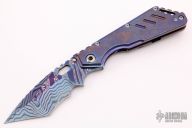 This MSC SMF XL by Mick Strider features a blued Damascus, nightmare ground, drop point, recurved tanto style blade with file worked spine, thumbhole and notched thumbrest. The handle is comprised of machined, textured and anodized titanium with a matching tip up clip over titanium barrel spacers. Lanyard hole in pommel. Hinderer Lock Bar Stabilizer for maximum reverse lock tension. Includes padded and zippered case. Excellent condition.