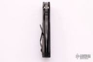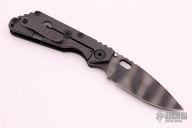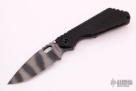 This SNG framelock folder by Mick Strider features a tiger stripe blade and a dimple pattern black aluminum and flamed titanium frame and tip up titanium clip. Includes a "Lock Bar Stabilizer" for maximum reverse lock retention. Nice detent, lockup and blade seating. Excellent condition.