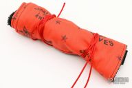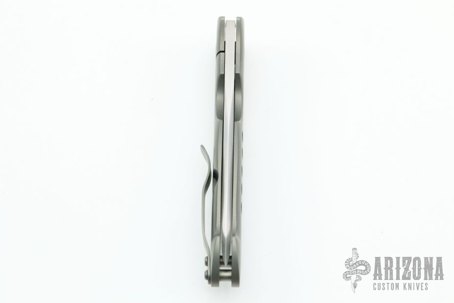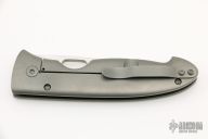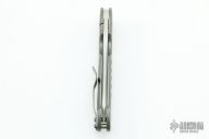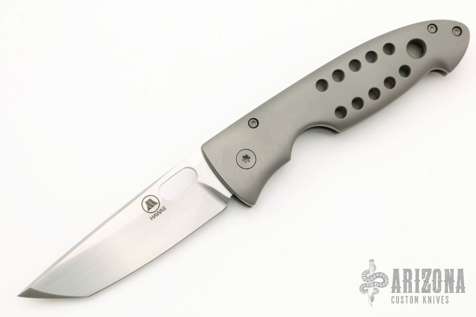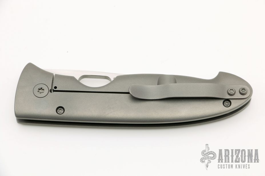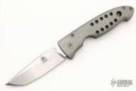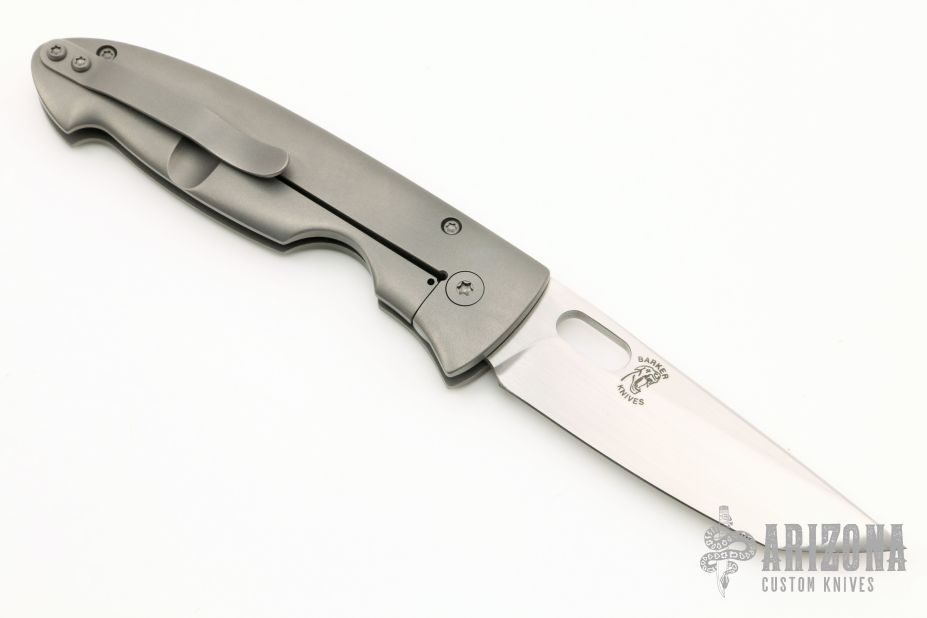 This framelock by Tom Mayo and John Barker features a hand rub satin finished Lum style tanto blade with thumbhole. The handle has a bead blasted titanium frame with tip up clip. Excellent condition. Nice detent, lockup and blade seating, rides on washers. Comes with cloth pouch. Excellent condition.