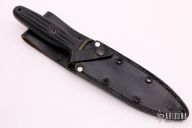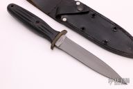 This Applegate-Fairbairn Combat Dagger (#02971) by Blackjack Knives has a bead blasted D/E spear point blade with hidden tang. .175" Blade Stock.  1.097" Blade Depth.   Handle is non-slip black lexan with contoured grooves, brass guard, and lanyard hole. Includes leather sheath. Excellent condition.
