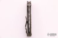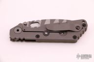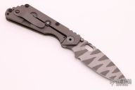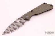 This SNG by Strider has a custom tiger stripped blade with dual thumb studs, thumb hole, and notched thumb rest. Handle is sculpted green G-10 and bead blasted titanium frame with lockbar stabilizer, and bead blasted titanium tip up clip. Has a small scuff on the clip, otherwise excellent condition. Nice detent, lockup and blade seating.