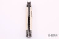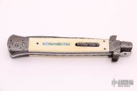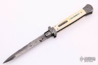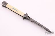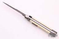 This Picklock by Burn Knives features a Mike Norris "Raindrop" Damascus bayonet style blade with false top edge, .202" stock. The handle has Damascus bolsters, front and rear, mammoth ivory scales with abalone inlays, fileworked Damascus push button, fileworked Damascus liners, stainless steel backspacer. Comes with a zippered case and COA dated 4-30-20. Excellent condition. Nice lockup, blade seating and action.