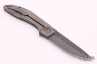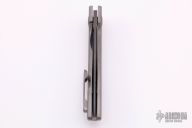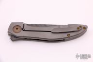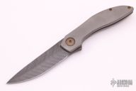 This IcePick flipper from Simeon Custom Knives features a Chad Nichols "Boom" Damascus blade with flipper. The handle has a bead blasted titanium frame, backspacer and tip up clip, bronze anodized hardware and pivot. This knife flips very well and locks up with absolutely no play. Blade is centered when closed. Very nice fit/finish. Comes with a padded case. Rides on bearings, nice detent, lockup and blade seating. Comes with cloth pouch and COA dated NCKS 2021. New from maker at the 2021 Nashville Custom Knife Show.