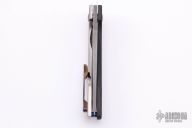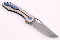 This Un-To flipper from Simeon Custom Knives features a smoke finished blade with flipper and thumbhole. The handle has a fat carbon and satin finished titanium frame with orange peel finished edges and tip up mokuti clip, blue anodized hardware and pivot. Very nice fit/finish. Comes with a padded case and COA dated NCKS 2021. Rides on bearings, nice detent, lockup and blade seating. New from maker and the 2021 Nashville Custom Knife Show.