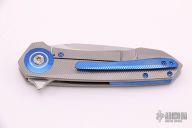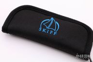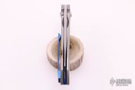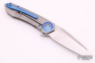 This Drifter flipper from Steven Skiff features a hand rub satin finished blade with flipper. The handle has a milled and bead blast finished titanium frame with anodized titanium tip up clip, pivot collars, hardware and backspacer. Very smooth action on Skiff Bearings with a nice detent, lockup and blade seating. Includes nylon zippered case. Excellent condition.