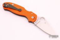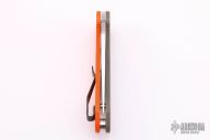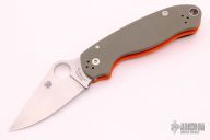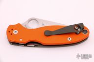 This Para 3 by Spyderco features a satin finished clip point blade with thumb hole and notched thumbrest. CPM REX 45 Blade Steel. The handle is comprised of OD Green and Orange G-10 frame over nested steel liner and stand-offs. The pocket clip is 4 way adjustable. Comes with a custom titanium deep carry clip and original SS clip. Includes original box and paperwork. Excellent condition.