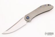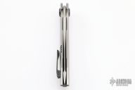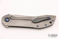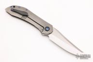 This Framelock Flipper by Jim Burke features a satin finished blade with notched flipper. The handle has a blasted and milled titanium frame, zirconium pivot collars, backspacer and tip up clip with hidden screws, anodized titanium hardware. Rides on bearings, nice detent, lockup and blade seating. Comes with original box. New from maker at the 2021 Blade Show.