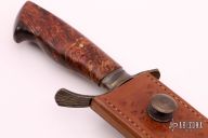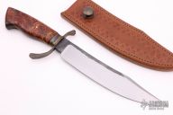 This Bowie by Jay Replogle features a hand rub satin finished blade with forge finished flats and sharpened top edge, .256" blade stock and 1.633" blade depth, hidden tang construction. The handle has a textured brass guard and fluted collar, stabilized black ash burl wood grip that is nicely contoured. Comes with a hand tooled brown leather sheath with brass belt stud, and a zippered case. Comes with COA. New from maker at the 2021 Blade Show.