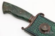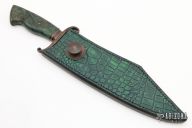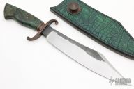 This Bowie by Jay Replogle features a hand rub satin finished blade with forge finished flats and sharpened top edge, .252" blade stock and 2.156" blade depth, hidden tang construction. The handle has a textured copper guard and fluted collar, stabilized maple burl wood grip that is nicely contoured. Comes with a hand tooled green leather sheath with copper belt stud, and a zippered case and COA. New from maker at the 2021 Blade Show.