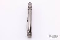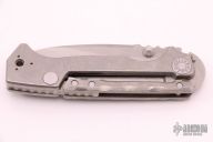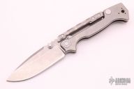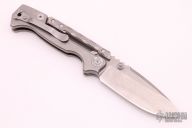 This AD-15 from Andrew Demko features a drop point tumble finished blade with swedge, dual thumb studs and notched thumbrest. The handle has a tumbled titanium frame with reversible titanium tip up clip and tumbled titanium backspacer. This knife features a unique "Scorpion Lock" locking mechanism. New condition.