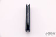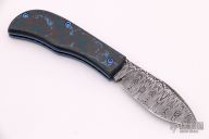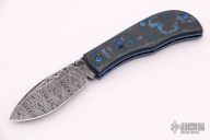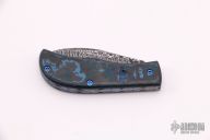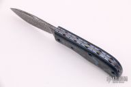 This Mini Nessie Slipjoint by Rainy Day Knives features a Damascus blade and spring (Cruforge V and 15n20). The handle has black/blue fat carbon covers, textured and anodized titanium liners with jeweled interiors. Has half-stop, flush in all positions. Comes with a black leather slip sheath, zippered case and COA. New from maker at the 2021 Blade Show.