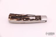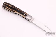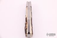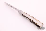 This Gunstock by Mike Zscherny features a hand rub satin finished clip point blade with a nail nick. The handle features fluted stainless steel bolsters, escutcheon and liners, stag covers, stainless steel spring. Has half-stop, flush in all positions. Includes a padded zippered case and COA. New From Maker at the 2021 Blade Show.