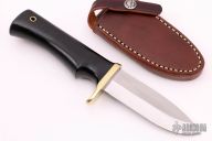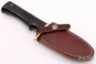 The Fireman Special by Randall is a non-catalog model with an extra-heavy beveled blade with 226" blade stock and 1.221" blade depth. This knife has a 4" stainless steel blade with notched thumbrest, brass guard, and a black linen micarta grip, full tang construction. Comes with a brown leather sheath and original paper wrapping. New from the 2021 Blade Show.
