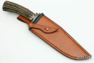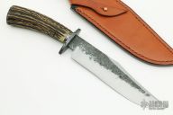 This Bowie by Erik McCright features a clip point blade with false top edge, .219" blade stock and 1.629" blade stock, hidden tang construction. The handle has a mosaic Damascus guard and butt with stag grip. Comes with a brown leather sheath and zippered case. Comes with COA dated 5-10-21. New from maker at the 2021 Blade Show.