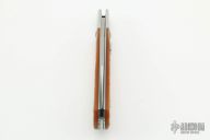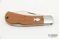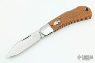 This lockback by Luke Swenson features a hand rub satin finished clip point blade with swedge and long pull nail nick. The handle is comprised of stainless steel bolsters, jigged brown paper micarta covers, stainless steel arrowhead escutcheon, stainless steel fileworked liners and a stainless steel lockbar with crosshatch pattern on the lock relief. Comes with zippered case. New from maker at the 2021 Blade Show.