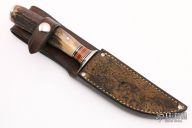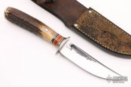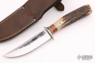 This Hunter by Jim Behring features a satin finished and hammer marked hollow ground blade with a false top edge, .169" blade thickness and 1.080" blade depth, hidden tang construction. The handle has a nickel silver guard and butt, stag grip, black/aluminum/red/yellow/blue spacer pattern. Great look and feel. Comes with brown leather sheath. New from maker at the 2021 Blade Show.