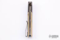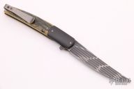 This Swayfront Persian Front Flipper by Brad Zinker features a Vegas Forge Web Damascus blade with checkered thumbrest and flipper. The handle has dovetailed Zirconium bolsters, mammoth ivory scales, anodized titanium liners with laser engraved interiors and a tip up anodized titanium clip. Rides on bearings, nice detent, lockup and blade seating. Comes with zippered case. New from maker at the 2021 Blade Show.